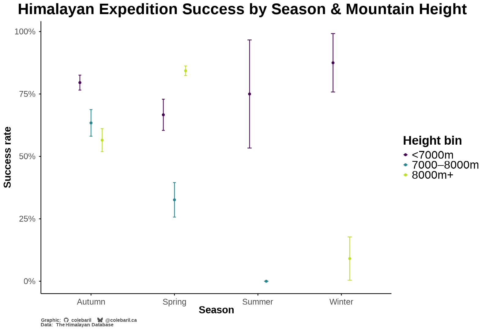 title = "Himalayan Expedition Success by Season & Mountain Height",