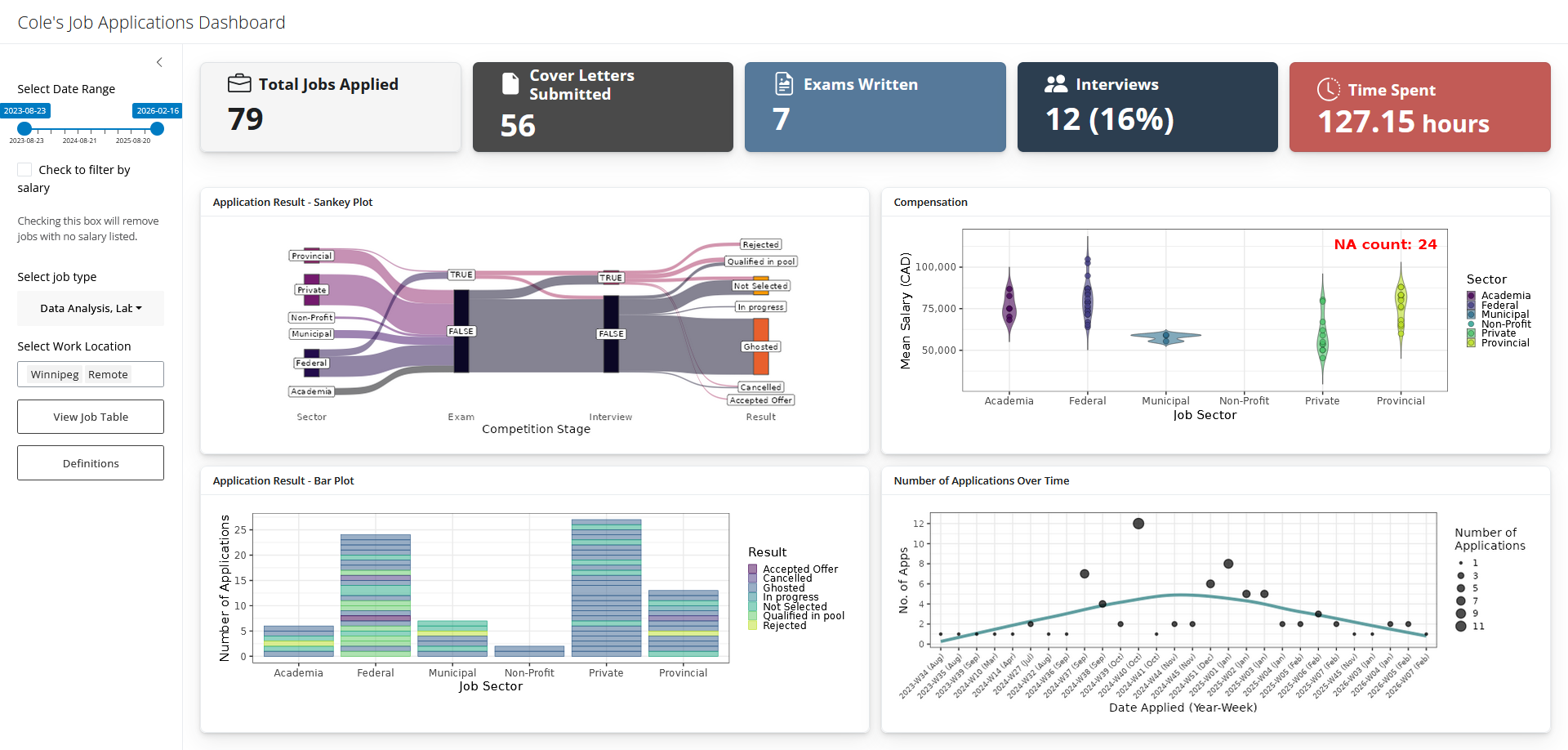 For this week’s Bring Your Own Data TidyTuesday, I wanted to share some of the data from my job search that I have packed into an interactive Shiny App. Click the link below to visit the app and explore the data.