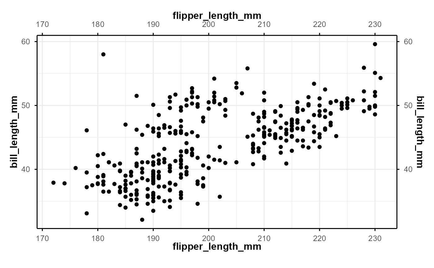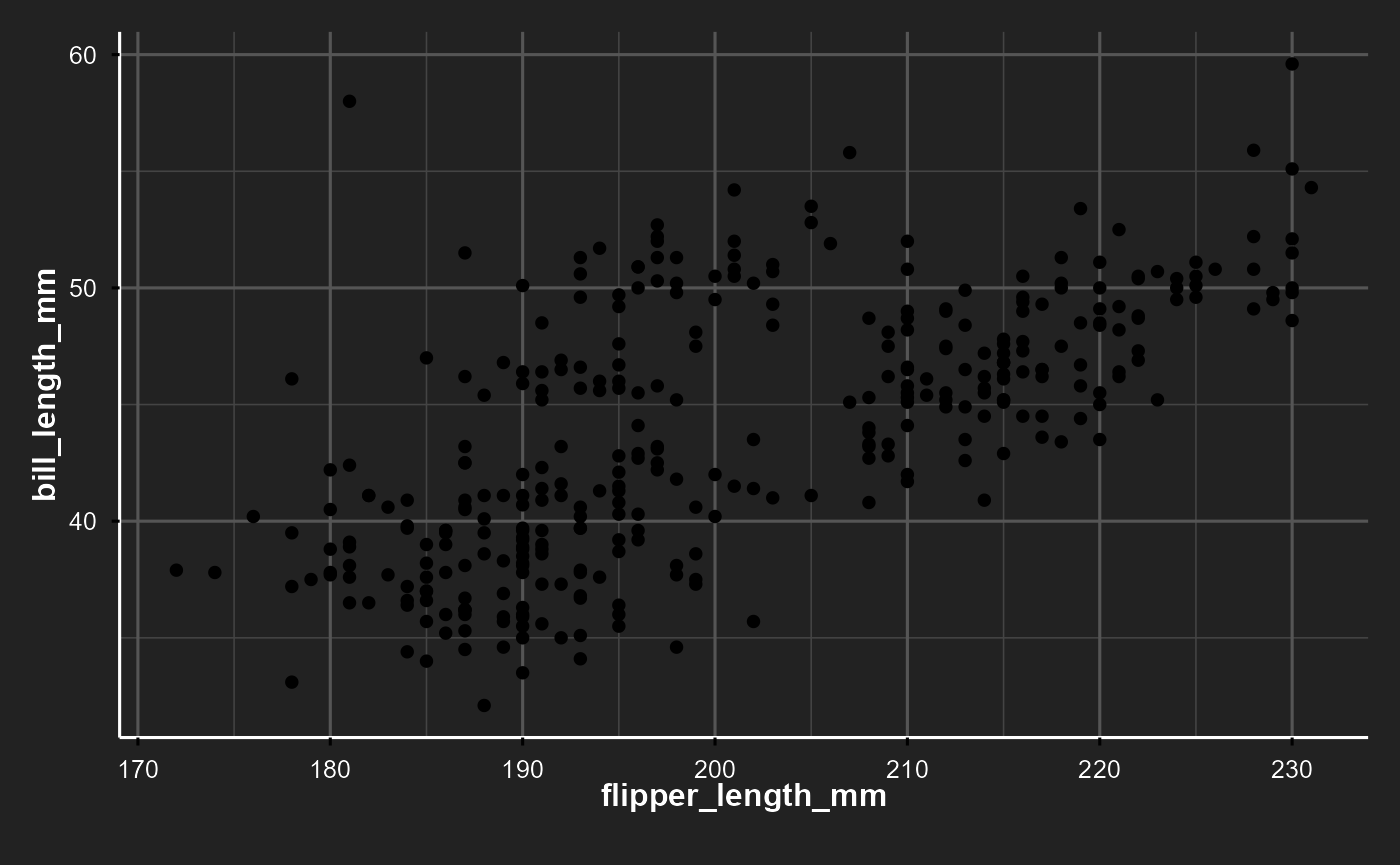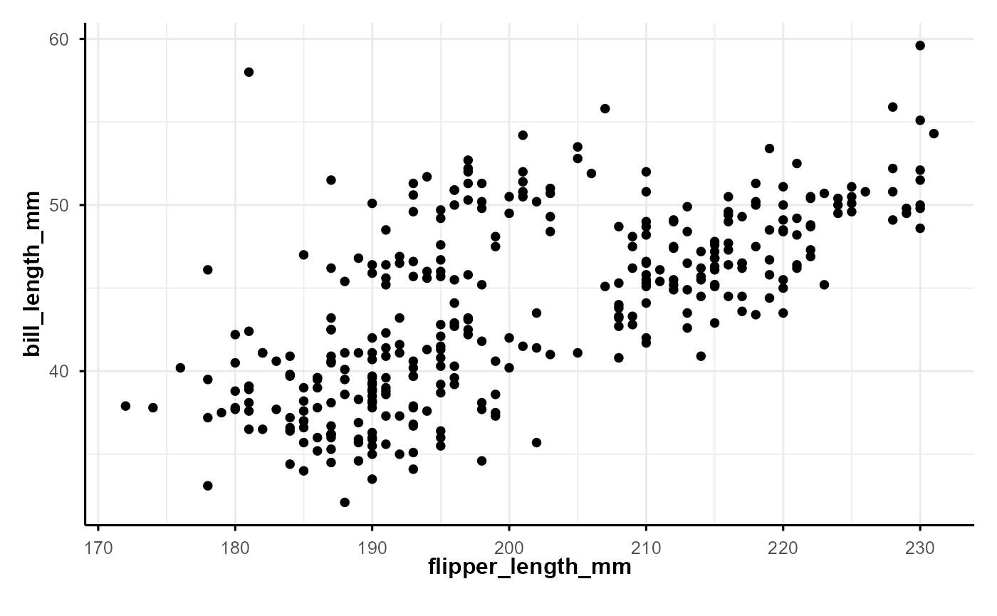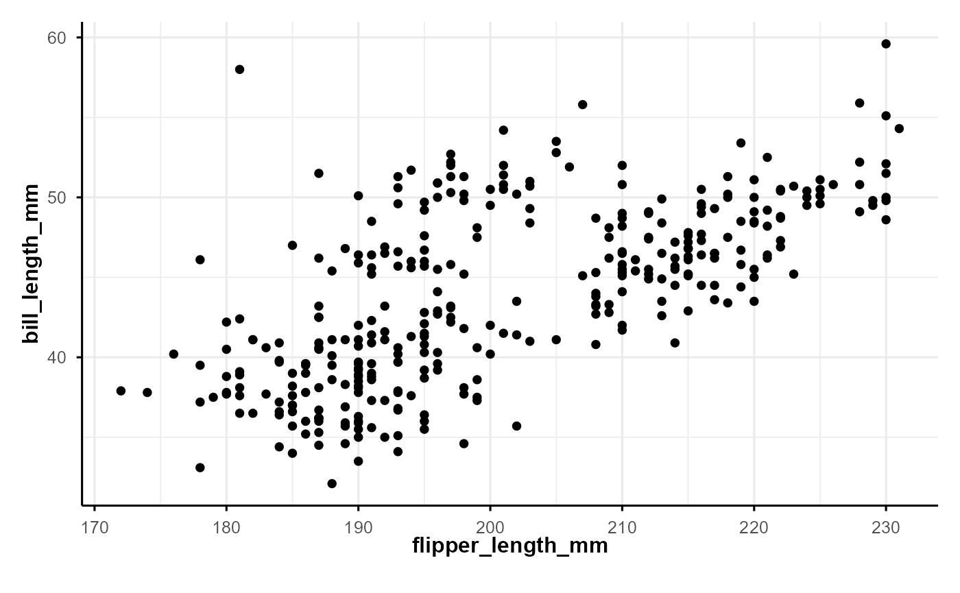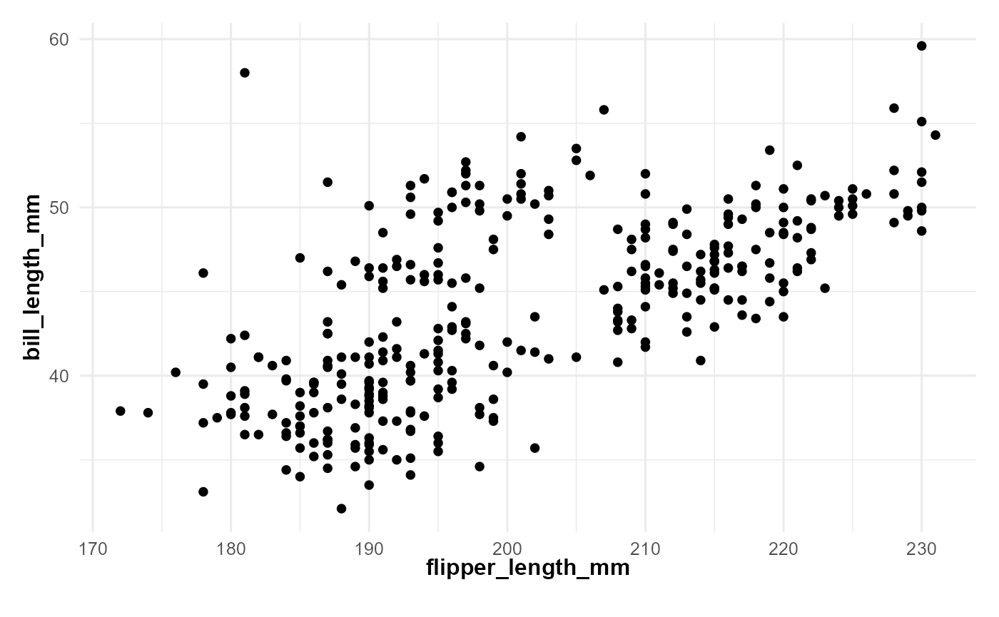 p <- ggplot(penguins, aes(flipper_length_mm, bill_length_mm)) +