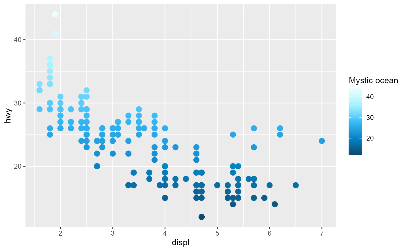 ggplot(mpg, aes(displ, hwy, colour = hwy)) +